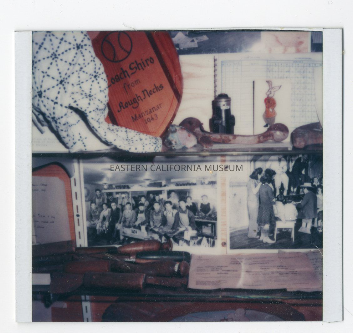 Color photo of a display case in the Manzanar Exhibit at the Eastern California Museum. Several photos and artifacts are visible.