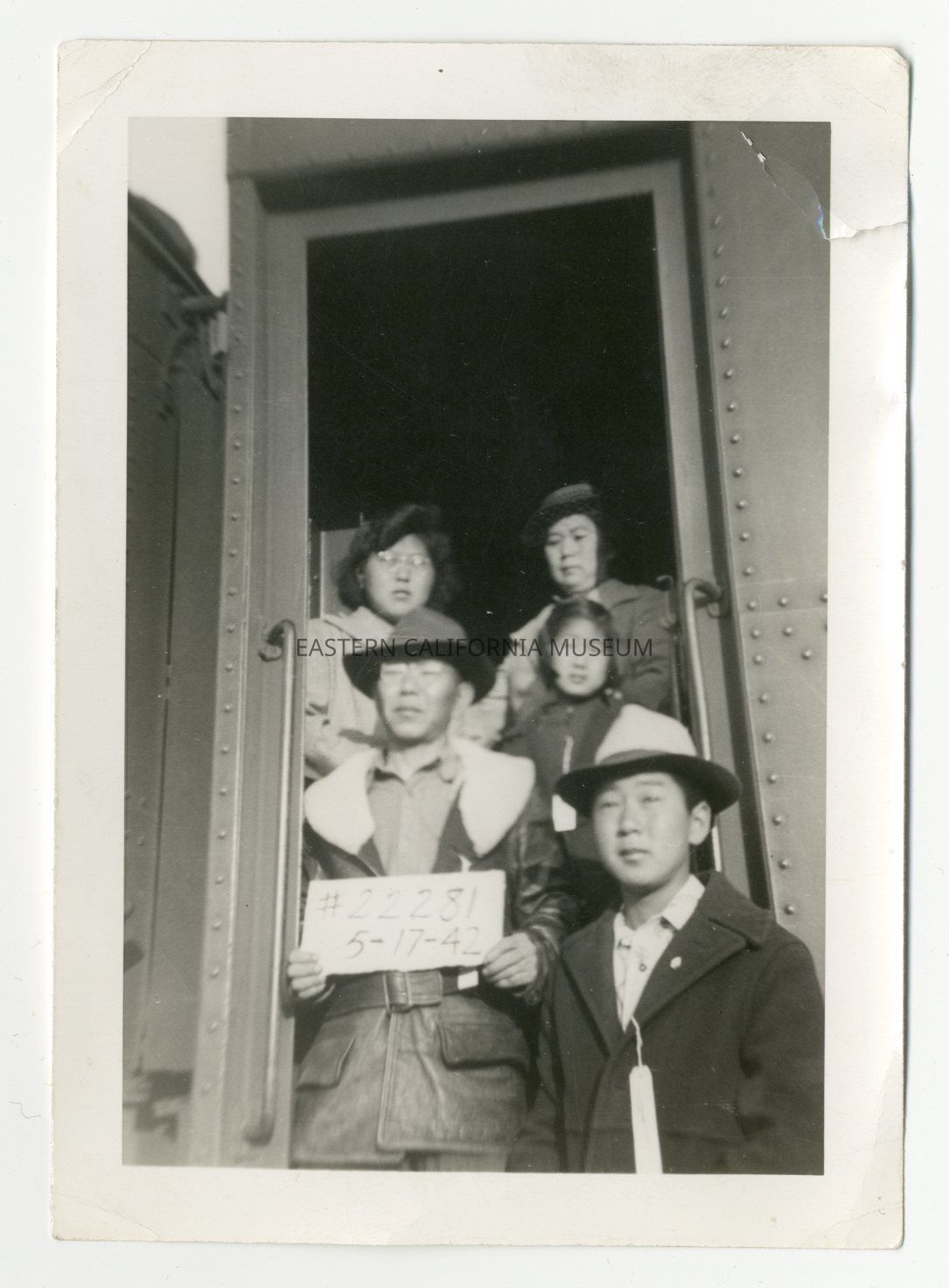 A label with this photo says, "Shimamura family boarding train for Manzanar."Collection