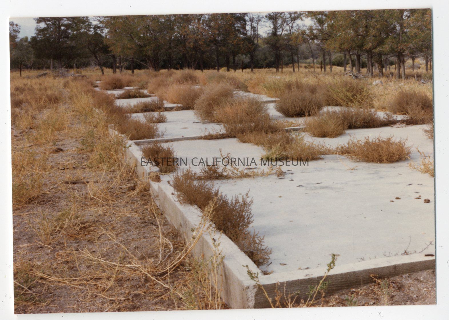 Color photo of a lot of concrete slabs, overgrown with rabbitbrush and other desert plants.