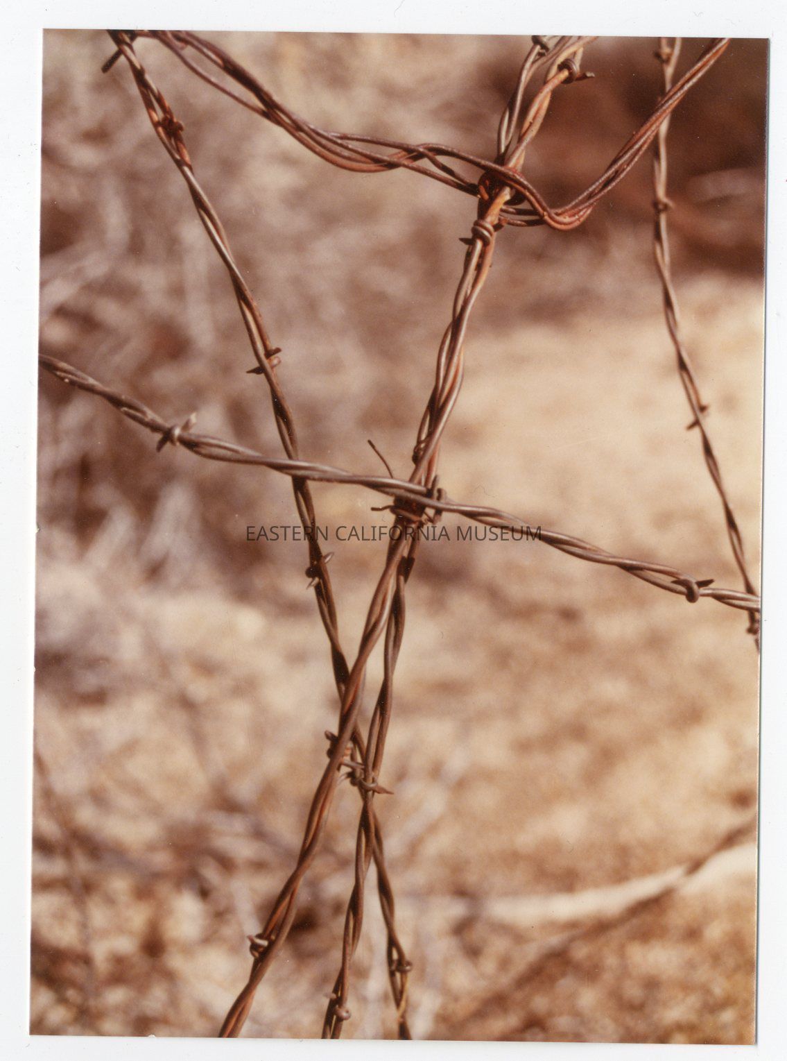 Color photo of barbed wire at Manzanar War Relocation Center.