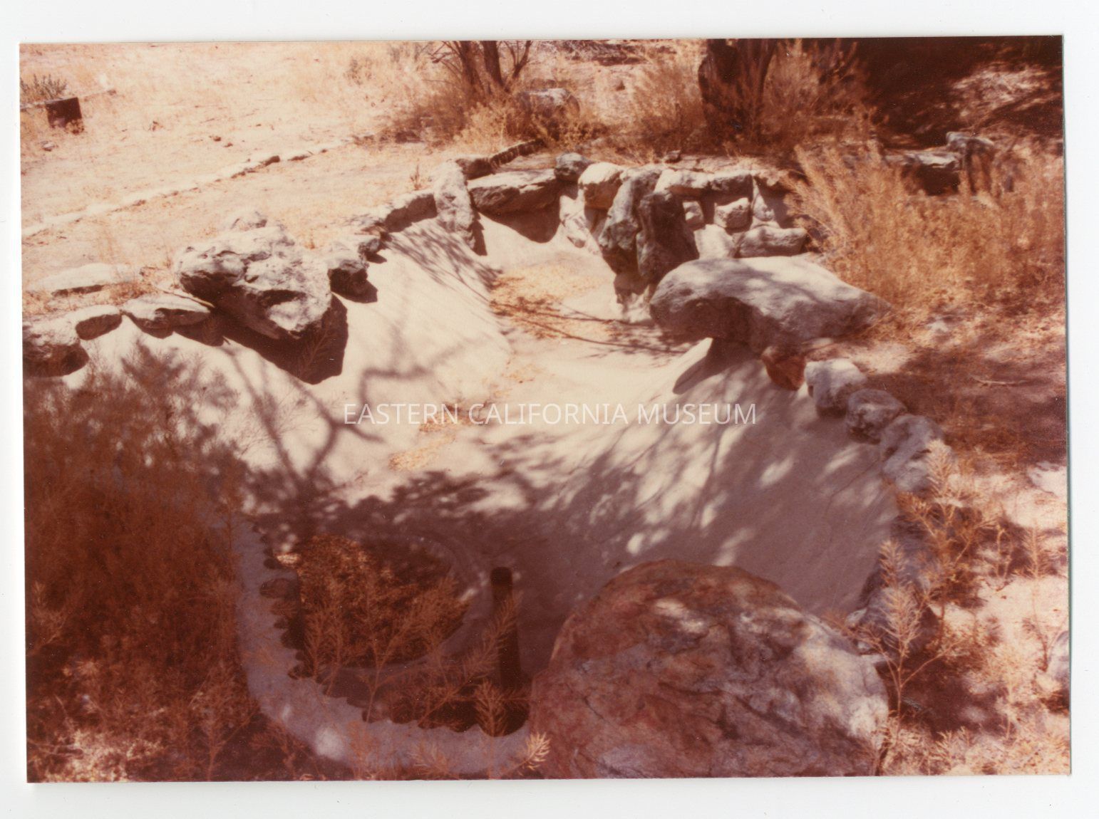 Color photo of the remains of a concrete pond lined with stones at Manzanar.