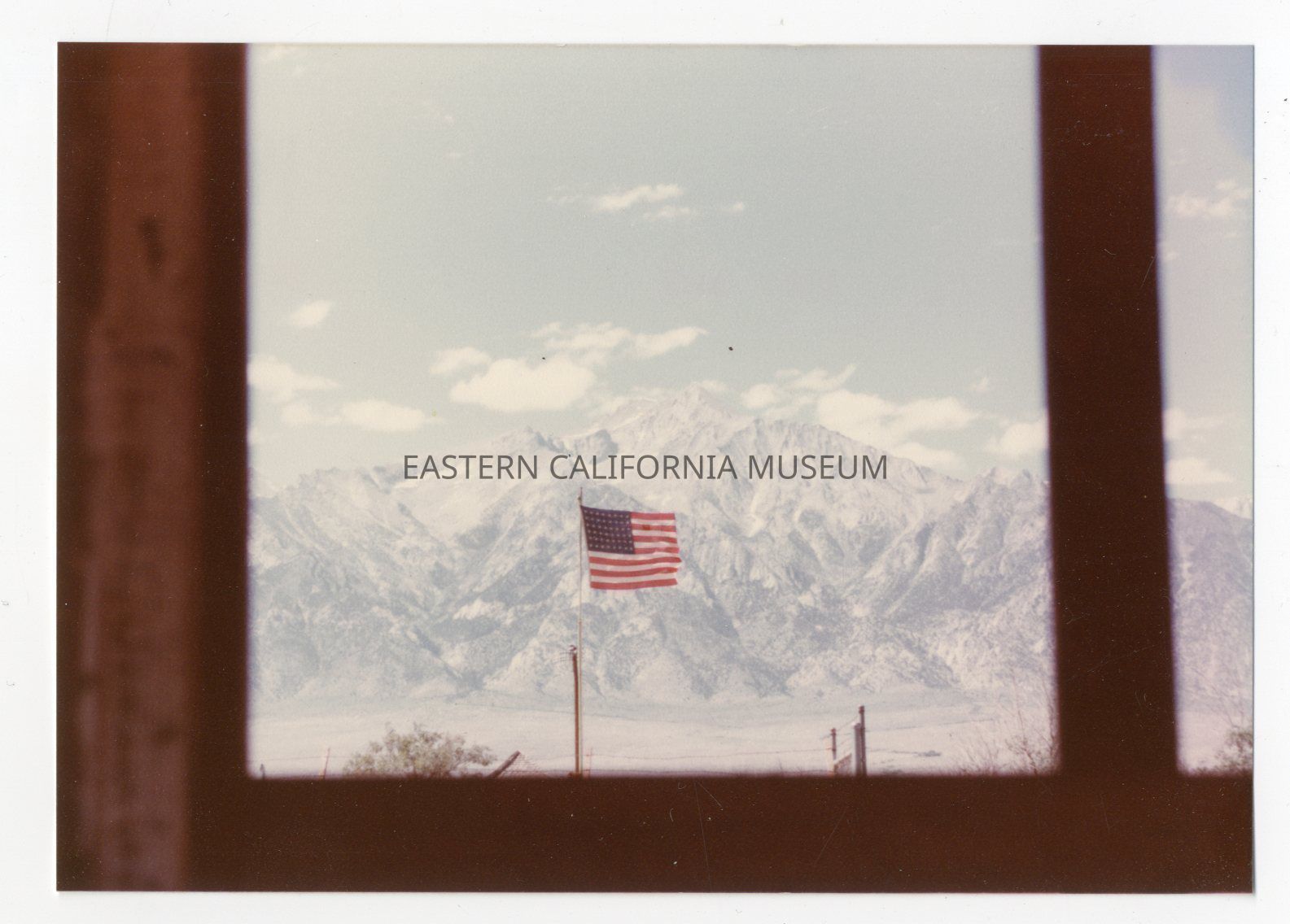 Color photo of an American flag flying at Manzanar with Mt. Williamson in the background.