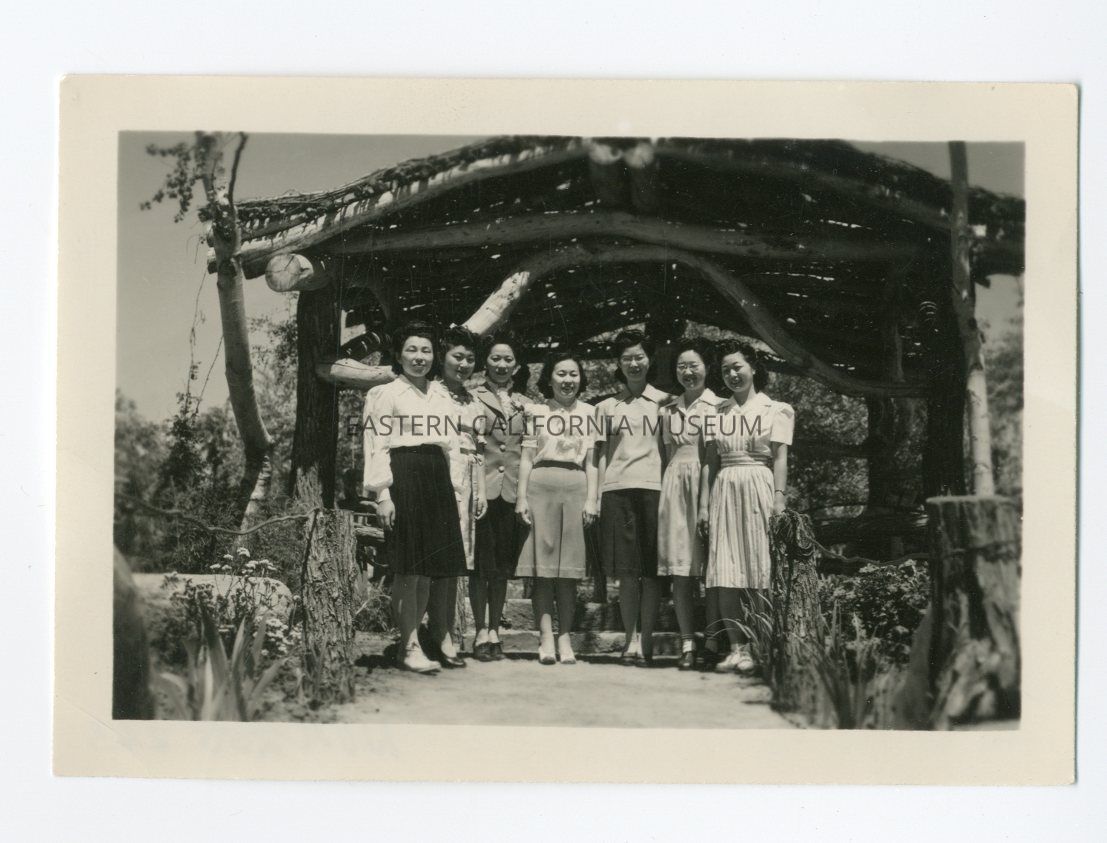 Small photo of seven young ladies standing in front of a wooden pergola at Manzanar War Relocation Center.