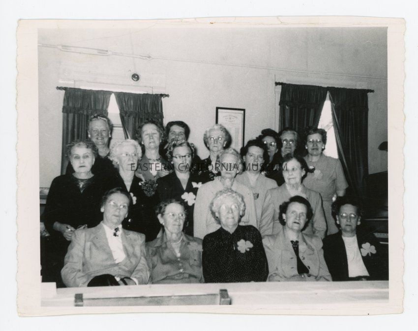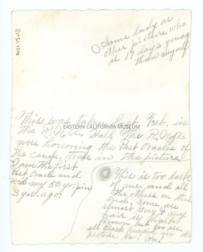 Handwritten in pencil on reverse: This was taken last Feb. in the R.N.A. Hall. The R.N. of A. were honoring the Past Oracles of the camp, those in the picture. I am the first Past Oracle and rec'd my 50 yr. pin 3 yrs. ago.