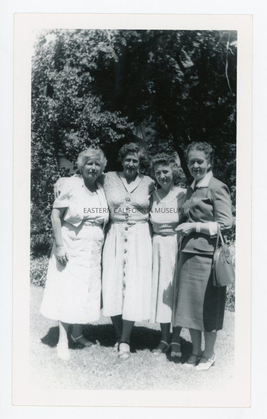 Handwritten in blue ink on reverse: Same group 1954 (I think). Edna, Enid, Clarice, Mabel. Memorial Day at Big Pine in the church yard.Collection