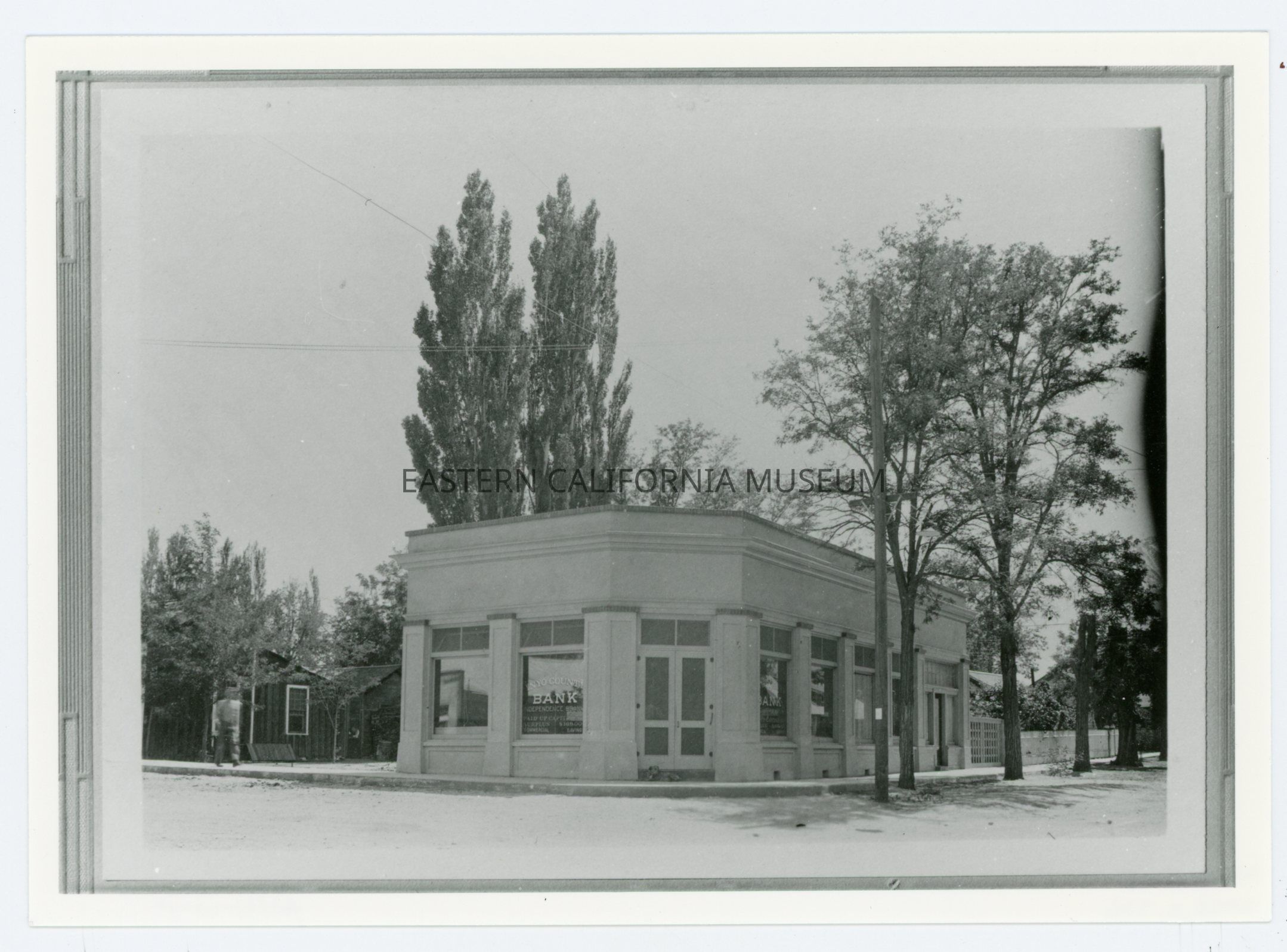 Copy of a photo of the Inyo County Bank in Independence. There is a man walking along the sidewalk from the left side of the photo.