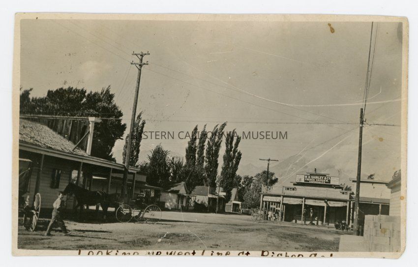 Photo postcard of a street and town scene. Sign on building says, "W. H. Shirley && Co. French Candies a Specialty" and "Bakery." No vehicles visible, but horse drawn wagons and buggies. Handwritten in black ink on bottom is: Looking up West Line St., Bishop, Cal.