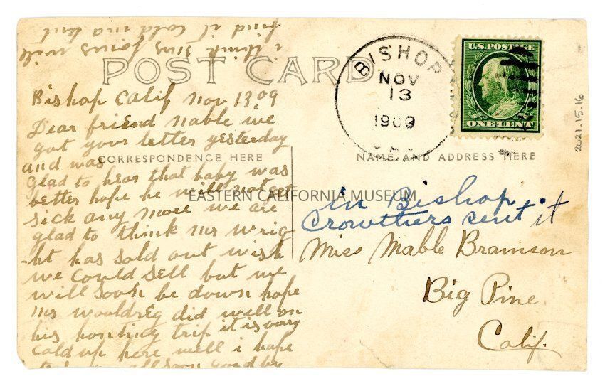The postcard was has a cancellation stamp from Bishop, Cal. dated November 13, 1909, and has a green one cent Benjamin Franklin stamp. It was sent to Miss Mable Branson in Big Pine, and a note that Crowthers sent it.Collection
