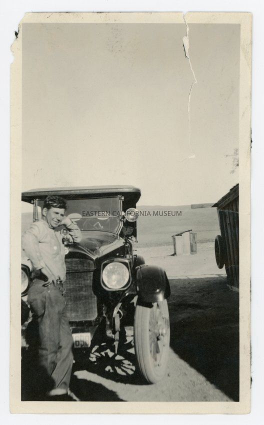 Photo of a man leaning against the hood of a vehicle. License plate ends with 698. Wood shed or building to right, another shack in the background.Collection
