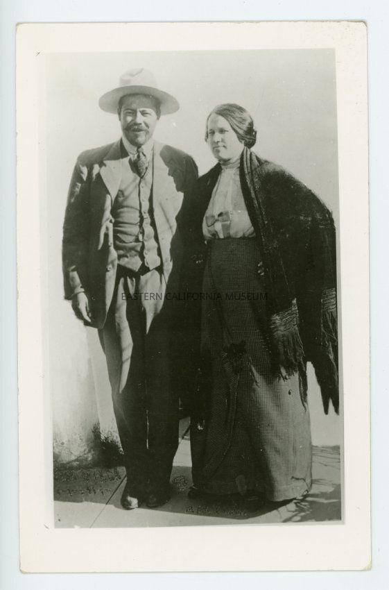 Spanish language photo postcard showing a man (appears to be Pancho Villa) and woman. The woman is wearing a fringed shawl.