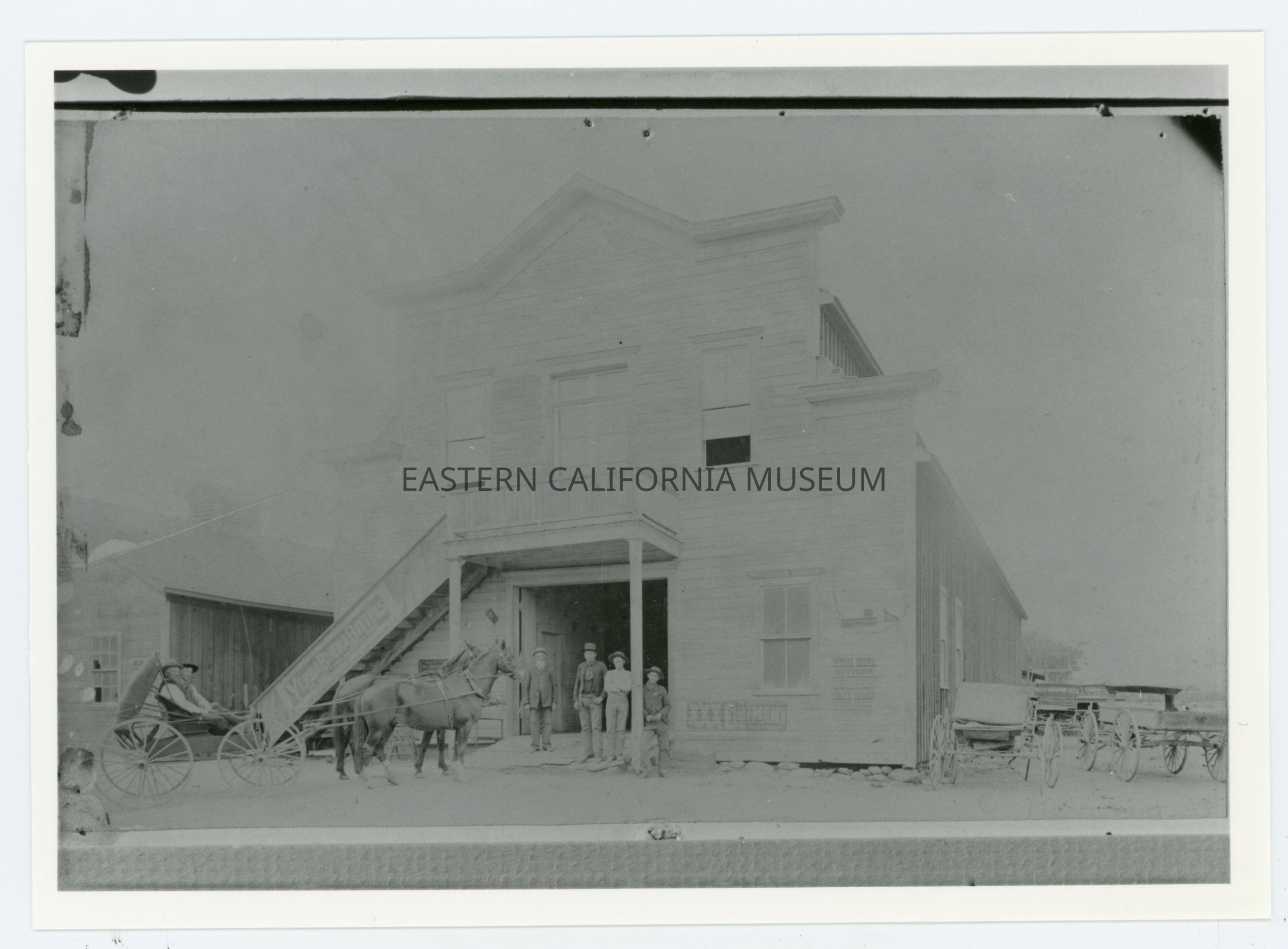 Copy of a faded photo of a two story wooden building. There are four men standing in front of the wide doorway, and a horse-drawn buggy with two men in it off to the left side. There are several wagons and/or buggies to the right side. There appear to be several advertisements painted on the side of the building.