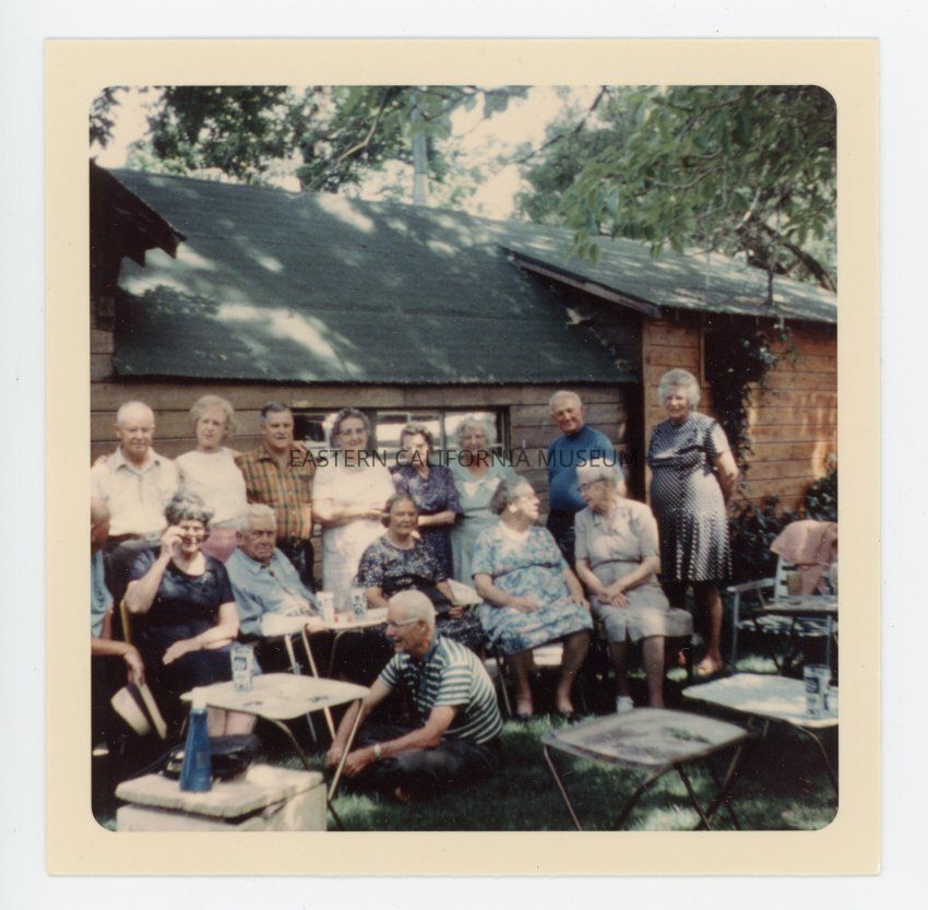 Square photo of a large group of older people gathered outside in front of a building.