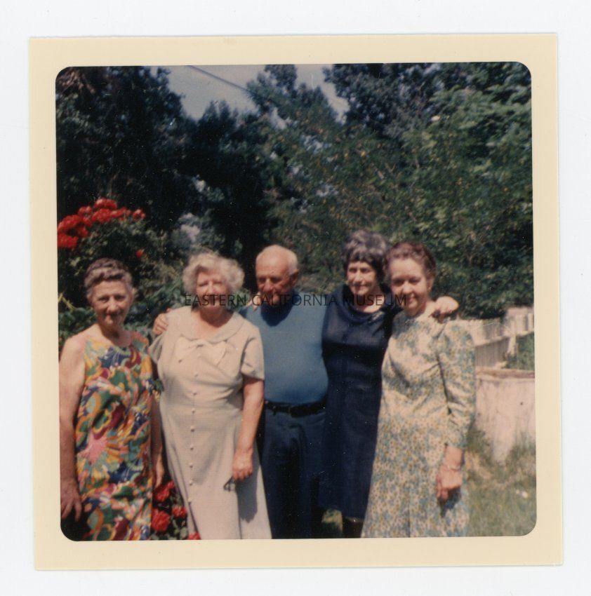 Square photo of five people (four women, one man). Could this possibly be the members of the 1916 graduating class of Big Pine High School consisting of Edna, Enid, Mabel, Clarice, and George Crocker?