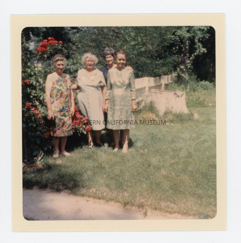 Square photo of a group of four older ladies in front of a flowering bush. Could this possibly be the members of the 1916 graduating class of Big Pine High School consisting of Edna, Enid, Mabel, and Clarice?