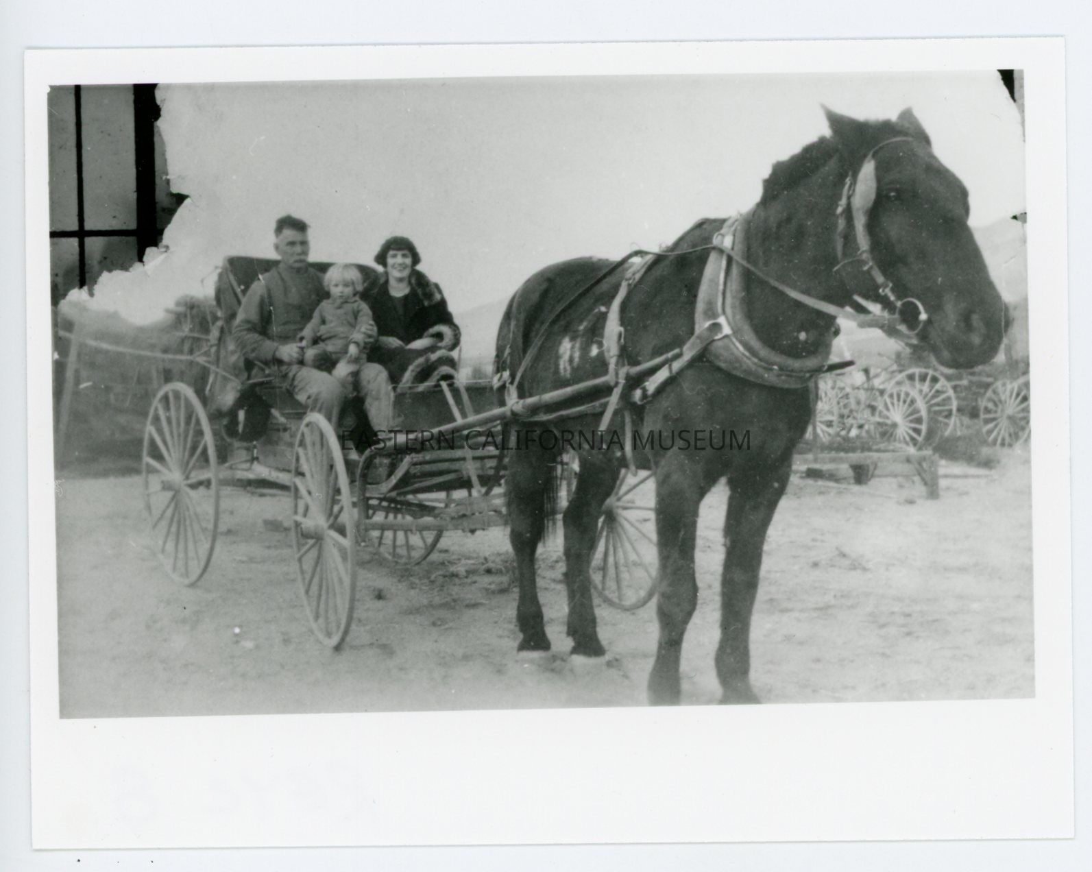 2008.19.8--Photo of a horse and buggy in Aberdeen. From left to right in buggy: John Jones, Clyde, Ada Reynolds. 1925