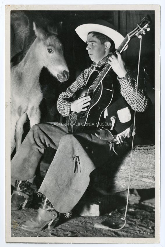 Cowboy with guitar and colt in background. Almost looks like a movie set or promo photo. Stamped on back: "Dave Packwood / 2601 So. Figueroa / Phone RI 3111, Los Angeles"
