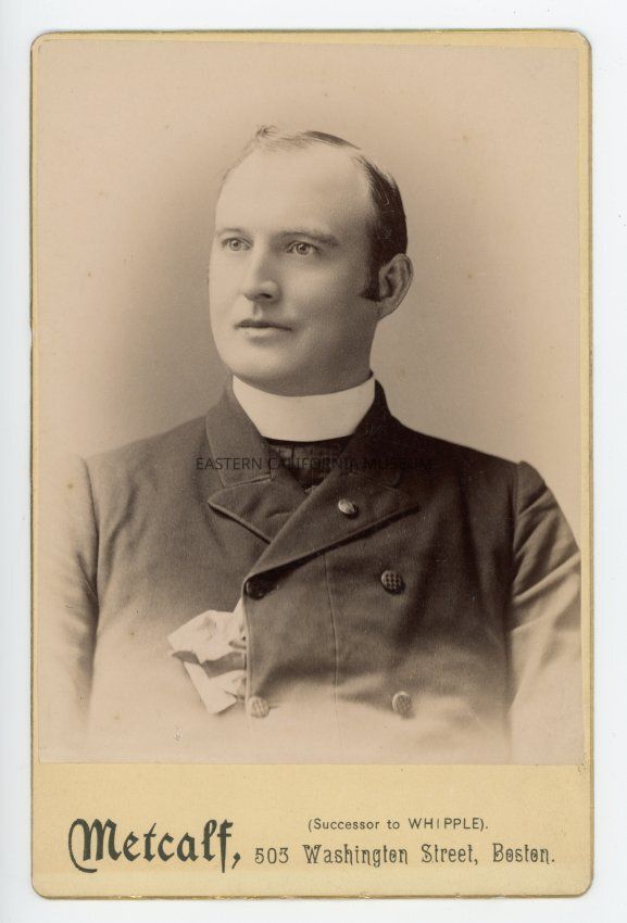 Mounted bust length studio portrait of a man wearing a white collar. Photographer was Metcalf, the successor to Whipple, of Boston.