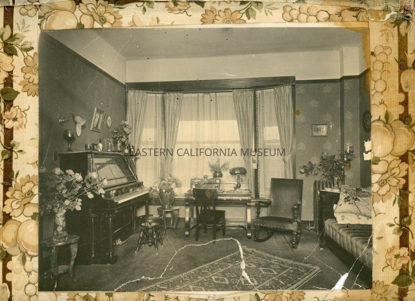 Black and white print of the interior of a house. Piano, chairs, couch, desk, rug, vases, knickknacks. The photo is bordered with a floral and fruit wallpaper. Photo is torn and in poor condition.