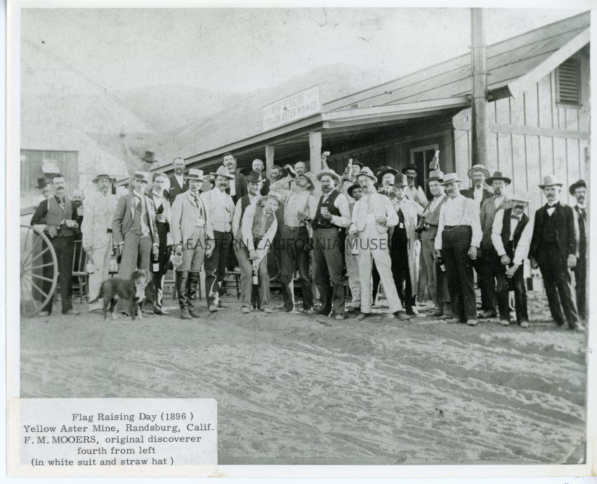 Print (not original) of Flag Raising Day, 1896, Yellow Aster Mine, Randsburg, California. F. M. Mooers, the original discoverer, is fourth from left in white suit and straw hat. Sign above building says, "Office Yellow Aster M&M Co."Photograph Details