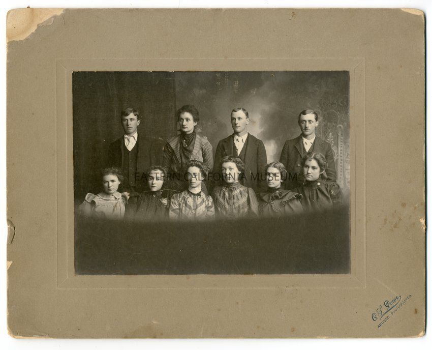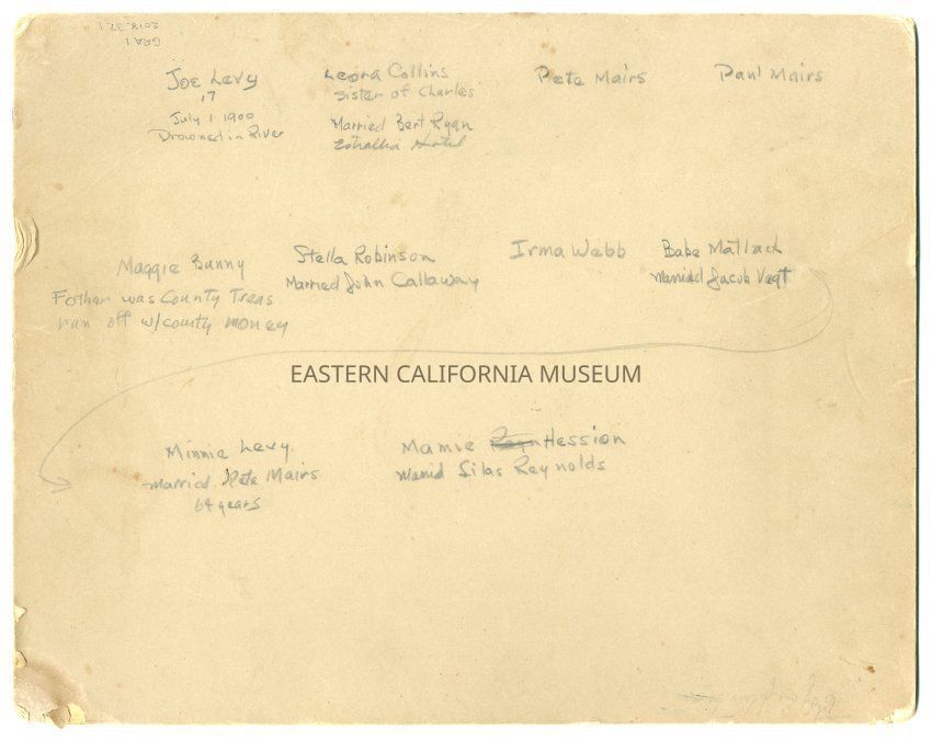 Mounted photo of ten people, all of whom have been identified on the reverse. Standing, back row, from left to right: Joe Levy (17, July 1, 1900, drowned in river), Leora Collins (sister of Charles, married Bert Ryan [Rhine], Estallia [Istalia] Hotel), Pete Mairs, Paul Mairs. Sitting, front row, from left to right: Maggie Bunny (father was County Treasurer, ran off with county money), Stella Robinson (married John Callaway), Irma Webb, Babe Matlack (married Jacob Vagt), Minie Levy (married Pete Mairs, 64 years), and Mamie Hession (married Silias Rynolds).