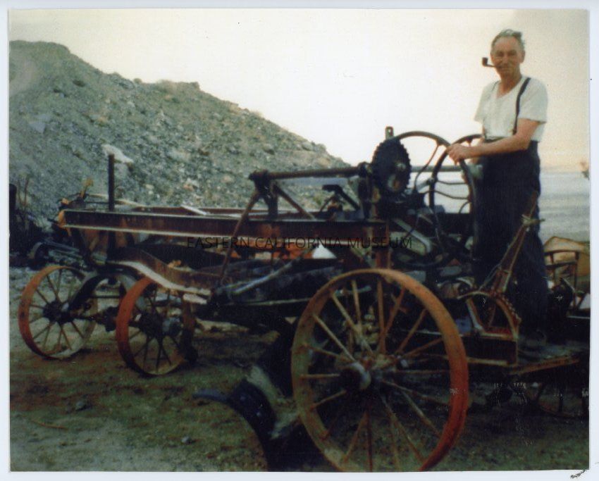Photo of a man standing on an old piece of what is likely mining equipment. Big dirt pile in background might be tailings from a mine?