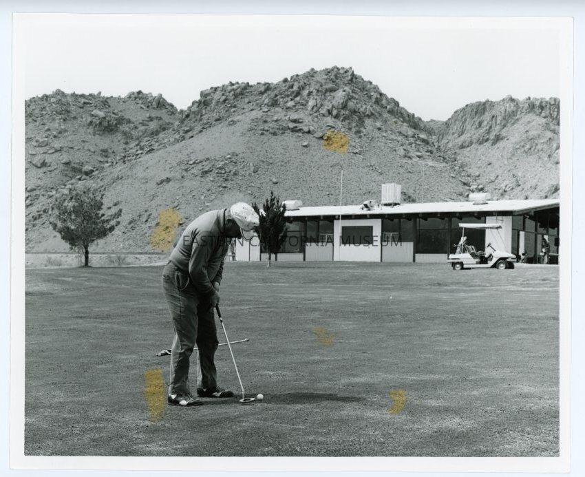 Photo of a man golfing at the Mt. Whitney Golf Course in Lone Pine. There are several spots of discoloration. Photo taken by Les Larson.Collection