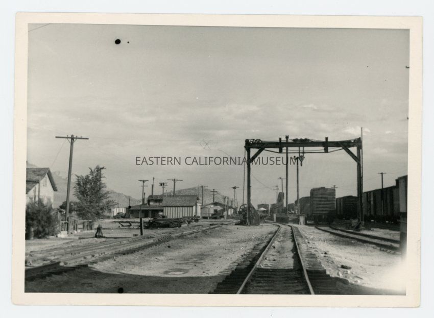 Written in pencil on reverse: 42. "X" Bulk soda ash conveyor. 1--Section house. Eating house built of old boxcars remodeled 1944, sets back this side of station. Tool house for handcar and tools for section [illegible] (Striped bldg.). Broad gauge to right. 1938--800 broad gauge cars of potatoes grown at [illegible] Bakersfield's Bidart family.