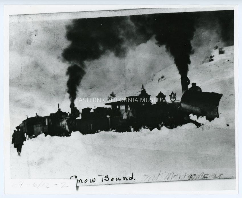 Stamped in blue with sections handwritten in blue ink on reverse: Original photo from Eastern Calif. Museum Assoc. Collection. Held in fireproof storage by Chalfant Press, Bishop California. 68-6/12-2. Snowbound train, Mt. Montgomery.Collection