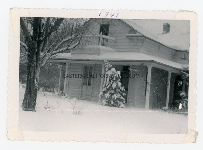 Photo taken in 1941 of the former hospital building at Camp Independence, covered in snow. It was moved to Independence and converted to a private residence. Dorothy Cragen owned or lived in this house.