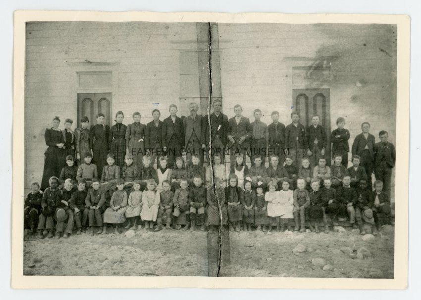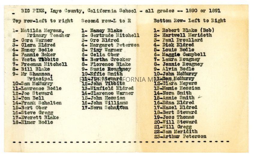 Copy of a school or class photo of the Big Pine School, all grades, 1890 or 1891. Mr. Shannon was the Principal. The original copy of the photo was torn in half and mended with tape, which is visible in this copy.