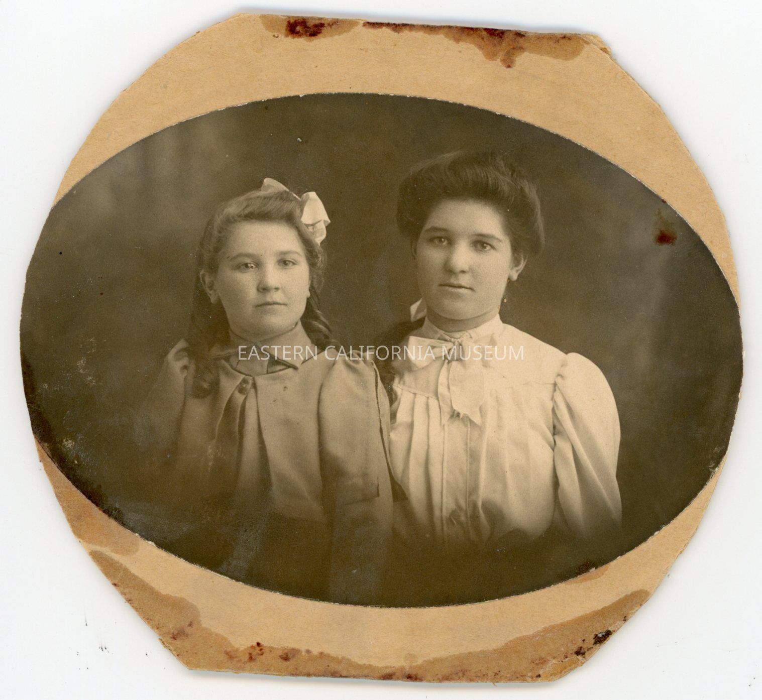 Mounted studio portrait of two young women. The photo is oval and the mat has been cut down. They are identified on the reverse as Sister (?) and Ora.