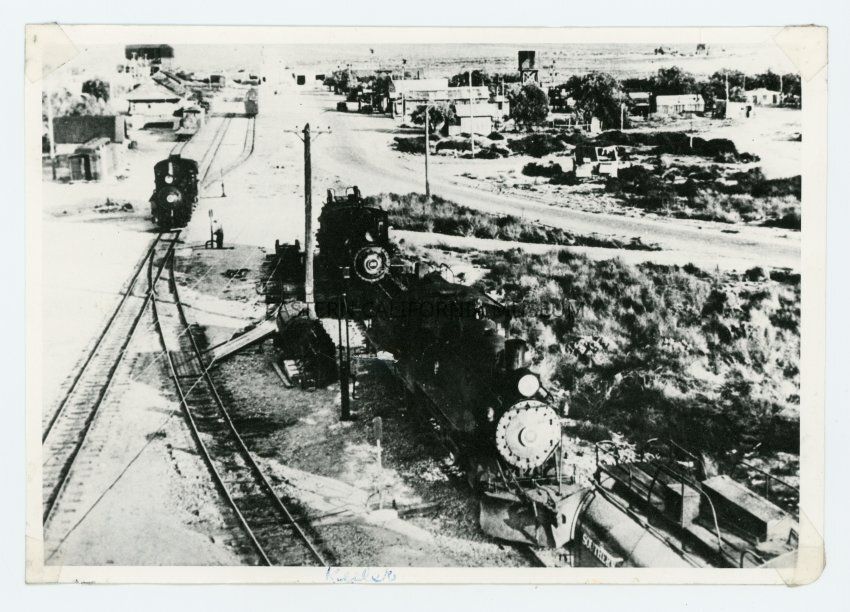 Photo taken from a high vantage point of several Southern Pacific engines at the train yard in Keeler, CA.
