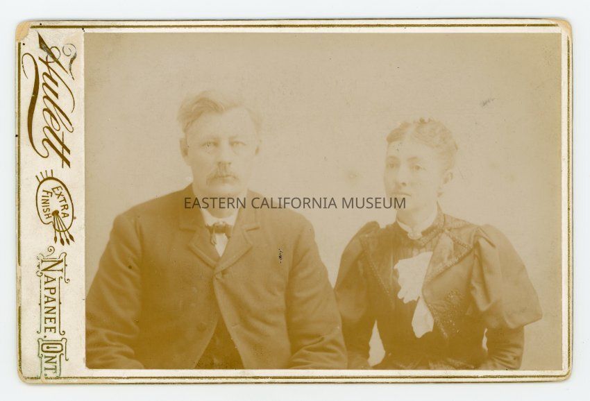 Mounted studio portrait of a man and a woman. They are identified on the reverse as Libby Tate McKim and Billy McKim circa 1890. Photographer was Hulett of Napanee, Ontario.
