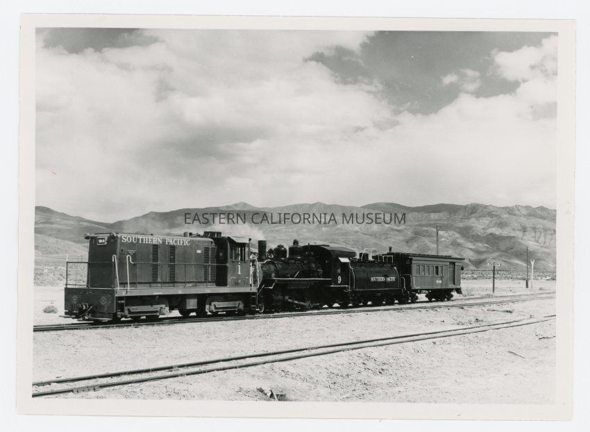 Photo of Southern Pacific engine #9 (and a caboose?) being towed to Laws on April 25, 1960 for donation to the City of Bishop. The photo was taken near the Zurich Station.Collection