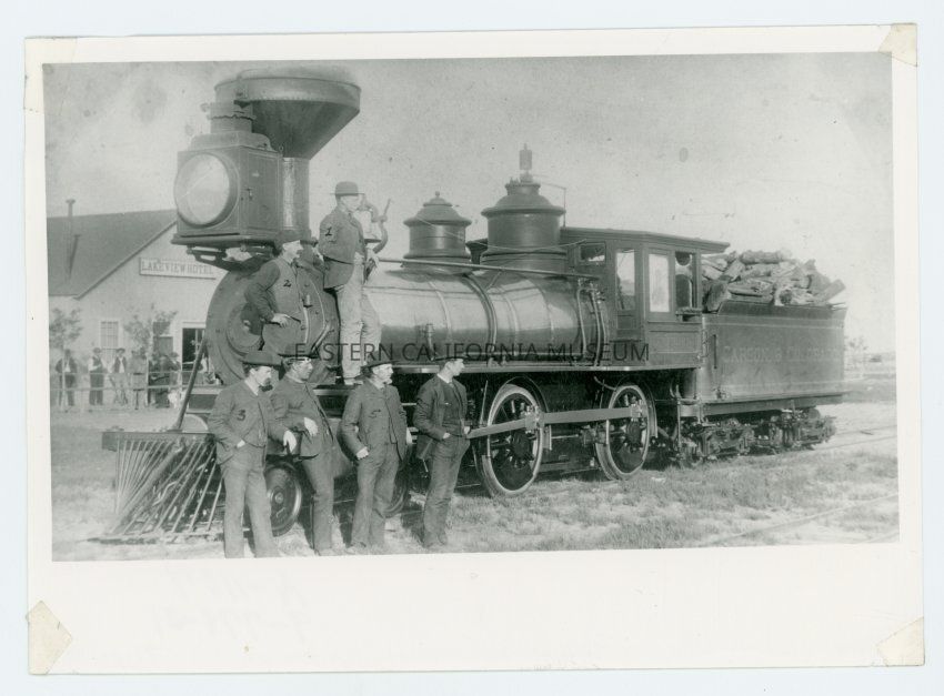 Photo of Carson and Colorado engine #6, "The Hawthorne," parked in front of the Lakeview Hotel at Keeler in 1885. Note the pile of wood for fuel in the tender car. There are six men posing on the engine, and while they are numbered they are not identified.Collection