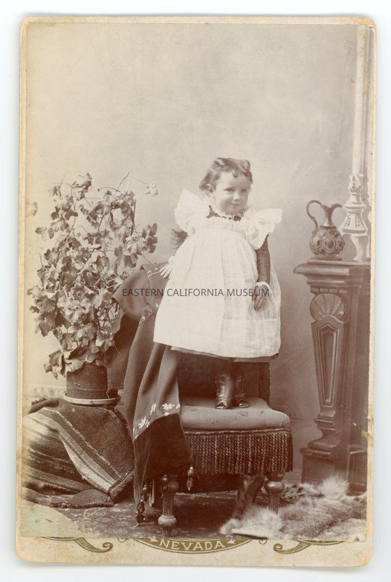 Mounted studio portrait of a young girl standing on a chair. She is identified as Clair [Clarice?] Tate, aged three, March 1900. Photographer or studio information is covered by print, but it may be H.P. Stimler's Sunbeam Gallery of Austin, Nevada.Collection