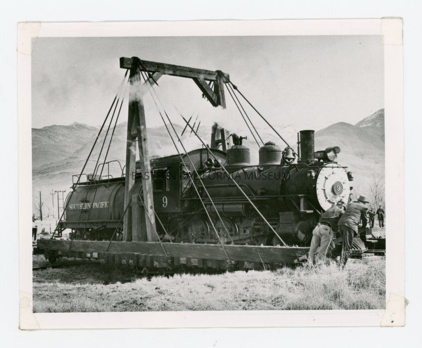 Photo of Southern Pacific engine #9 on the turntable at Laws in 1950. Two men are turning it while a few others stand around watching.