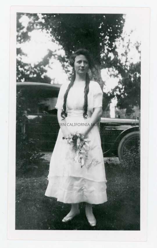 Full-length photo of a young woman in a white dress with long waist-length hair holding a bouquet. There is a car parked behind her. She is identified on the reverse as Clarice at her graduation in 1916 from Big Pine High School.Collection