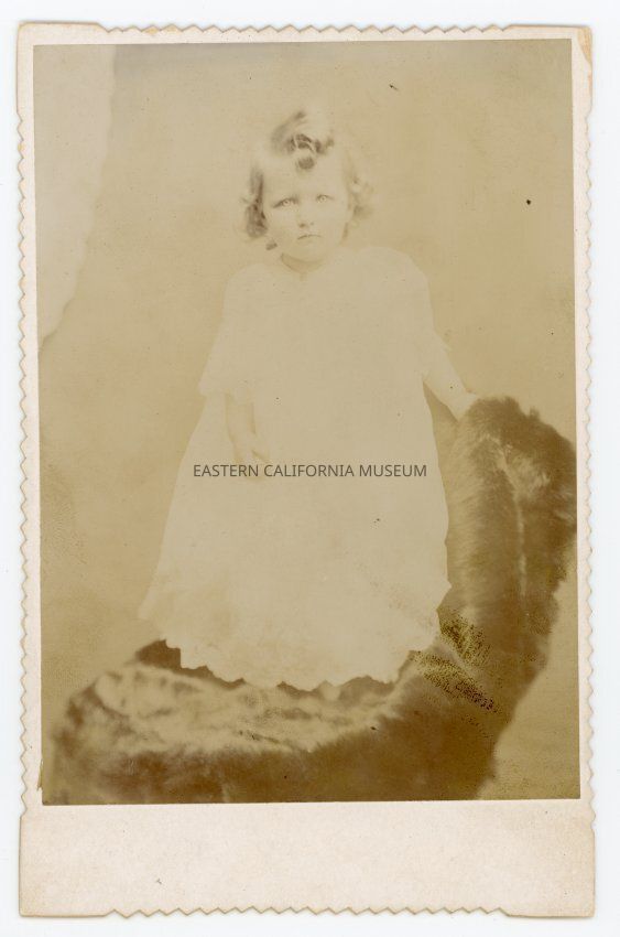 Mounted studio portrait of a young child in a white dress standing on a chair. Child is identified on reverse as Elsie Uhlmeyer, the daughter of William H. and Angie Uhlmeyer of Big Pine, CA. Photo is faded.Collection
