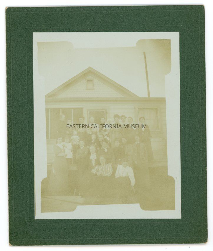 Mounted and badly faded photo of a large group of people standing in front of a house. They are identified on the reverse [handwriting is hard to read, so the typed list below may need editing].