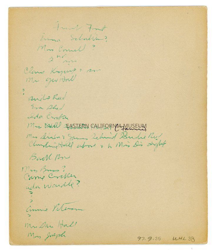 Front row: Emma Schallin (sp? Schalkin?), Mrs. Connell (sp? Cornell?). Second row: Clara Kispert and son, [illegible, maybe Mrs. Gerthall?], unknown, Birdie Reed, Eva Shed, Ida Crocker, Mrs. Schaltan (Baker) (Fannie), Mrs. [illegible, maybe Dixon?] and James behind Birdie, Clementine Hall above and to Mrs. D's right. Back row: Miss Bun (sp? Buss?), Carrie Crocker, Ada Wardel, unknown, unknown, Annie Peterson, unknown, Mrs. Dan Hall, Mrs. Joseph.Collection