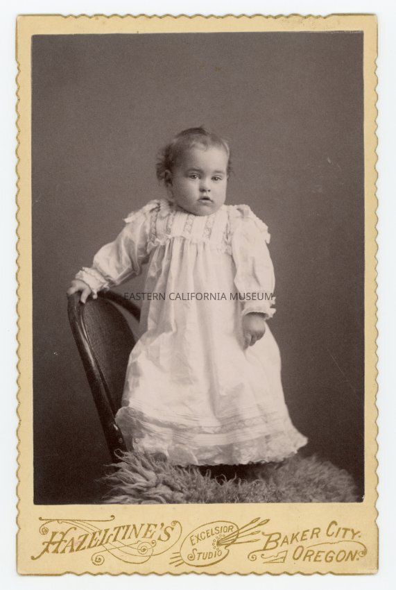 Mounted studio portrait of an unidentified baby in a white dress standing on a chair. Photographer is Hazeltine's Excelsior Studio of Baker City, Oregon.Collection