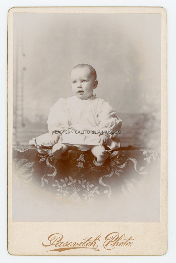 Mounted studio portrait of an unidentified baby sitting on an ornate tapestry. Photographer was Pasevitch.