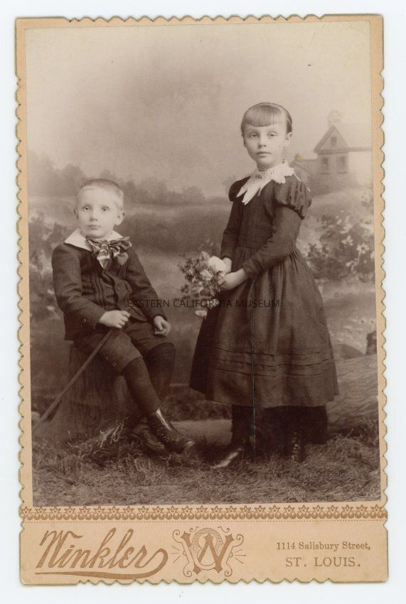 Mounted studio portrait of two unidentified children posing in a pastoral scene. Photographer was Winkler of St. Louis, Missouri. The edges of the mount are scalloped.Collection