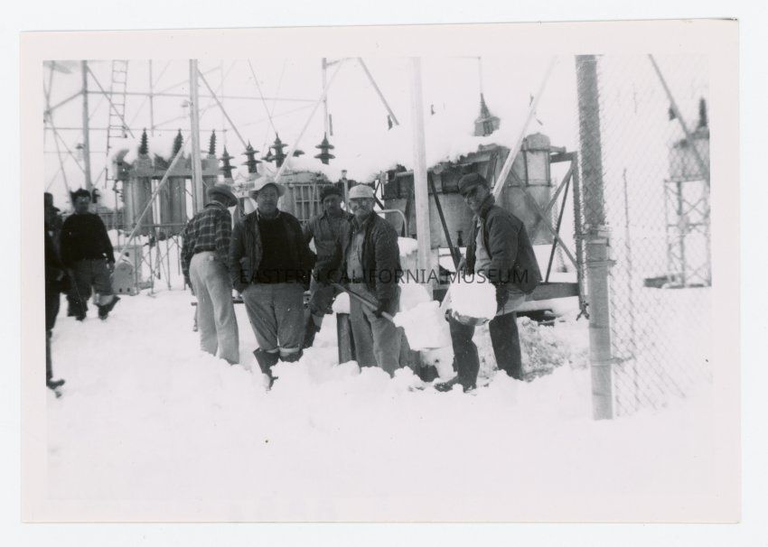 Photo of a group of men shoveling show at LADWP's Cottonwood Power Plant. A transformer facility is visible in the background.
