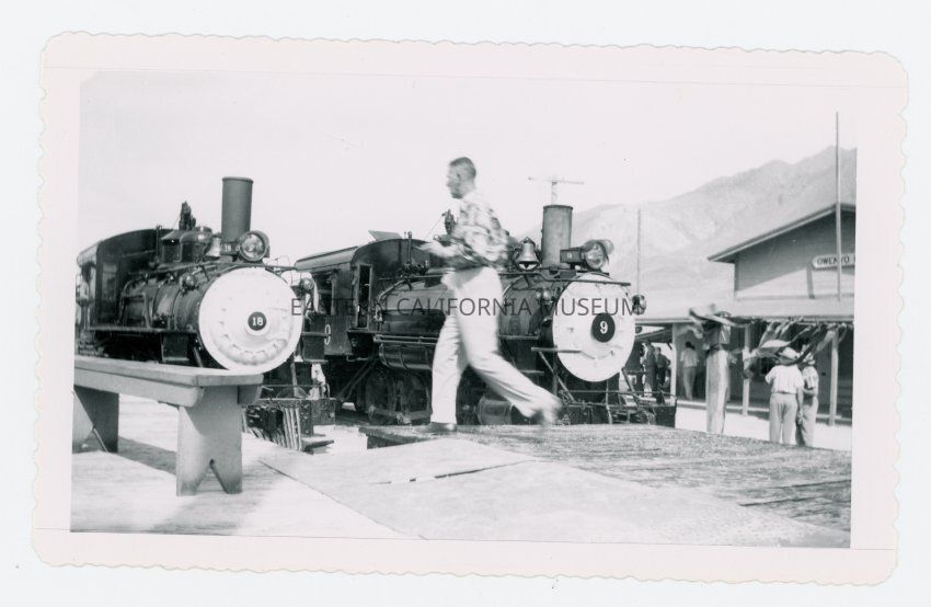 Photo of a man walking across the Owenyo railroad station platform. Behind him are Southern Pacific engines #18 and #9. The Owenyo Hotel is on the right side.