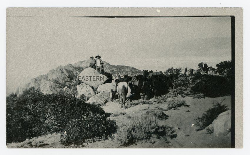 Photo of two people standing on a pile of boulders with a packtrain beside them.