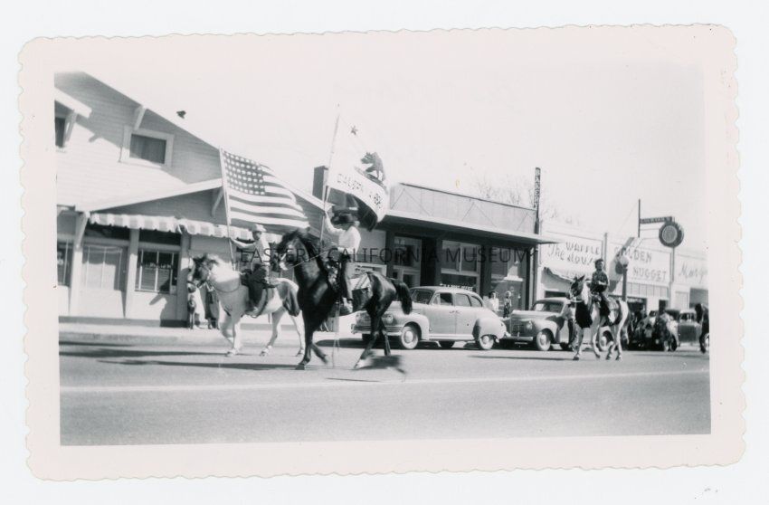 Photo of two people on horseback carring the U.S. flag and the California state flag in a parade. On the the other side of the street is the Post Office, the Waffle House, and the Golden Nugget. The print has scalloped edges.