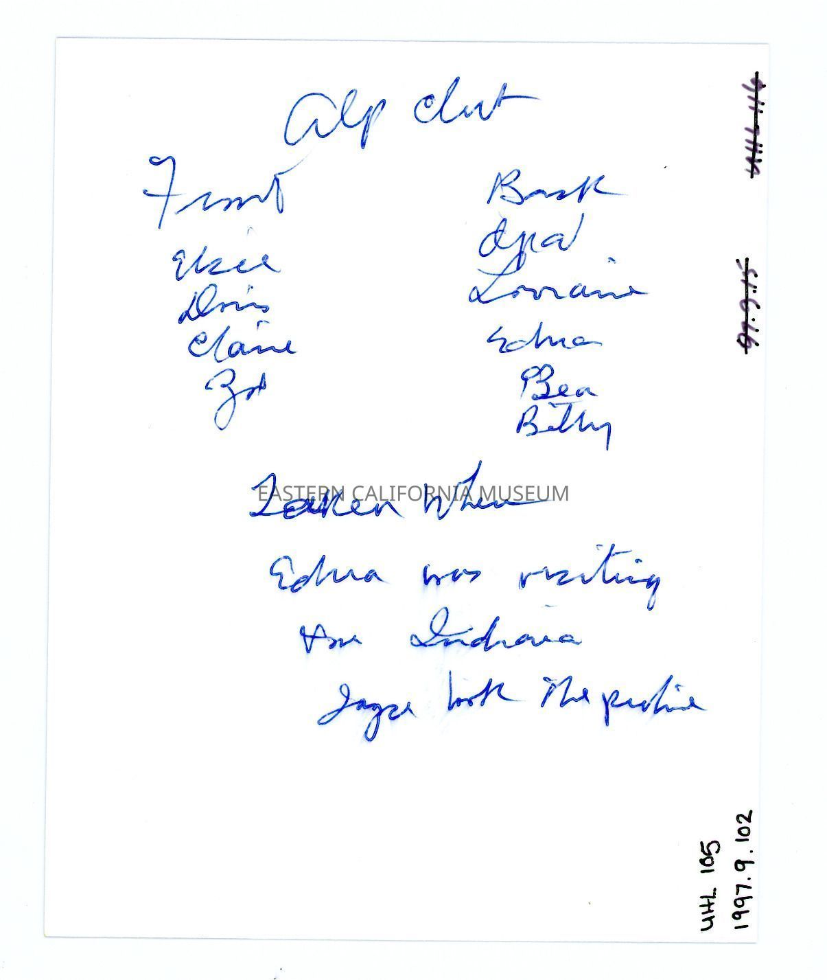 Handwritten in blue ink on reverse: Taken when Edna was visiting from Indiana. Joyce took the picture. [Illegible--maybe Alp?] Club. Front: Elsie, Doris, Clarice, Zoe. Back: Opal, Lorraine, Edna, Bea, Betty.
