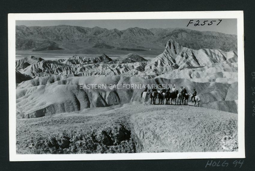 This is a photo of a group of people on horseback looking out at rock formations in Death Valley. The riders' backs are to the camera so you can't see any faces.